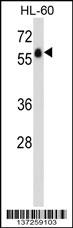 GPR97 Antibody (N-term) (Cat. APR04180G) western blot analysis in HL-60 cell line lysates (35ug/lane).This demonstrates the GPR97 antibody detected the GPR97 protein (arrow). |