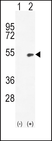 Western blot analysis of Bmp4 (arrow) using rabbit polyclonal Bmp4 Antibody (G20) (Cat. APR04185G). 293 cell lysates (2 ug/lane) either nontransfected (Lane 1) or transiently transfected (Lane 2) with the Bmp4 gene.