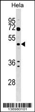 ALG2 Antibody (Center) (Cat. APR04195G) western blot analysis in Hela cell line lysates (35ug/lane).This demonstrates the ALG2 antibody detected the ALG2 protein (arrow). |