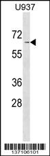 ASB2 Antibody (N-term) (Cat. APR04199G) western blot analysis in U937 cell line lysates (35ug/lane).This demonstrates the ASB2 antibody detected the ASB2 protein (arrow). |