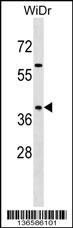 SYAP1 Antibody (C-term) (Cat. APR04202G) western blot analysis in WiDr cell line lysates (35ug/lane).This demonstrates the SYAP1 antibody detected the SYAP1 protein (arrow). |