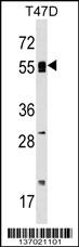 POLA2 Antibody (Center) (Cat. APR04203G) western blot analysis in T47D cell line lysates (35ug/lane).This demonstrates the POLA2 antibody detected the POLA2 protein (arrow). |