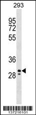 PEF1 Antibody (Center) (Cat. APR04204G) western blot analysis in 293 cell line lysates (35ug/lane).This demonstrates the PEF1 antibody detected the PEF1 protein (arrow). |