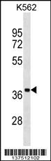 UBLCP1 Antibody (C-term) (Cat. APR04214G) western blot analysis in K562 cell line lysates (35ug/lane).This demonstrates the UBLCP1 antibody detected the UBLCP1 protein (arrow). |