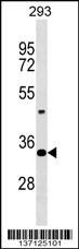 Mouse Hoxd9 Antibody (Center) (Cat. APR04248G) western blot analysis in 293 cell line lysates (35ug/lane).This demonstrates the Hoxd9 antibody detected the Hoxd9 protein (arrow). |
