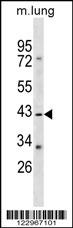 RASSF1 Antibody (Center) (Cat. APR04256G) western blot analysis in mouse lung tissue lysates (35ug/lane).This demonstrates the RASSF1 antibody detected the RASSF1 protein (arrow). |