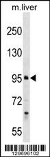 PROSER1 Antibody (N-term) (Cat. APR04259G) western blot analysis in mouse liver tissue lysates (35ug/lane).This demonstrates the PROSER1 antibody detected the PROSER1 protein (arrow). |