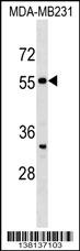 SEPT10 Antibody (N-term) (Cat. APR04263G) western blot analysis in MDA-MB231 cell line lysates (35ug/lane).This demonstrates the SEPT10 antibody detected the SEPT10 protein (arrow). |