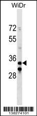 ITGB1BP2 Antibody (C-term) (Cat. APR04281G) western blot analysis in WiDr cell line lysates (35ug/lane).This demonstrates the ITGB1BP2 antibody detected the ITGB1BP2 protein (arrow). |