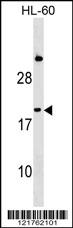 IFNA1 Antibody (C-term) (Cat. APR04285G) western blot analysis in HL-60 cell line lysates (35ug/lane).This demonstrates the IFNA1 antibody detected the IFNA1 protein (arrow). |