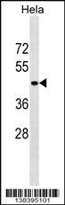 SERPINB11 Antibody (Center) (Cat. APR04300G) western blot analysis in Hela cell line lysates (35ug/lane).This demonstrates the SERPINB11 antibody detected the SERPINB11 protein (arrow). |