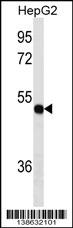 TXNDC5 Antibody (Center) (Cat. APR04301G) western blot analysis in HepG2 cell line lysates (35ug/lane).This demonstrates the TXNDC5 antibody detected the TXNDC5 protein (arrow). |