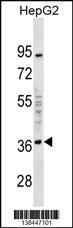 EDA2R Antibody (C-term) (Cat. APR04308G) western blot analysis in HepG2 cell line lysates (35ug/lane).This demonstrates the EDA2R Antibody detected the EDA2R protein (arrow). |