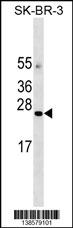 AGTRAP Antibody (C-term) (Cat. APR04313G) western blot analysis in SK-BR-3 cell line lysates (35ug/lane).This demonstrates the AGTRAP Antibody detected the AGTRAP protein (arrow). |