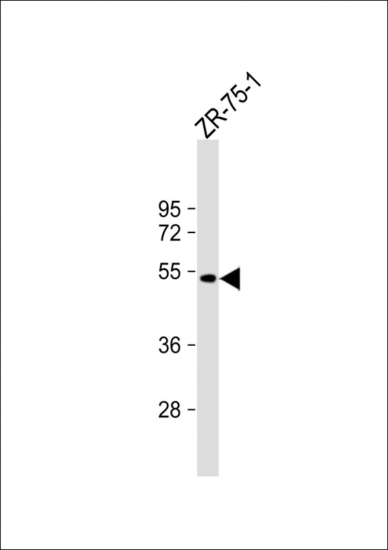 Anti-BRP16 Antibody (Center) at 1:1000 dilution + ZR-75-1 whole cell lysate Lysates/proteins at 20 μg per lane. Secondary Goat Anti-Rabbit IgG, (H+L), Peroxidase conjugated at 1/10000 dilution. Predicted band size : 42 kDa Blocking/Dilution buffer: 5% NFDM/TBST.