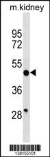 BRP16 Antibody (Center) (Cat. APR04322G) western blot analysis in mouse kidney tissue lysates (35ug/lane).This demonstrates the BRP16 antibody detected the BRP16 protein (arrow). |