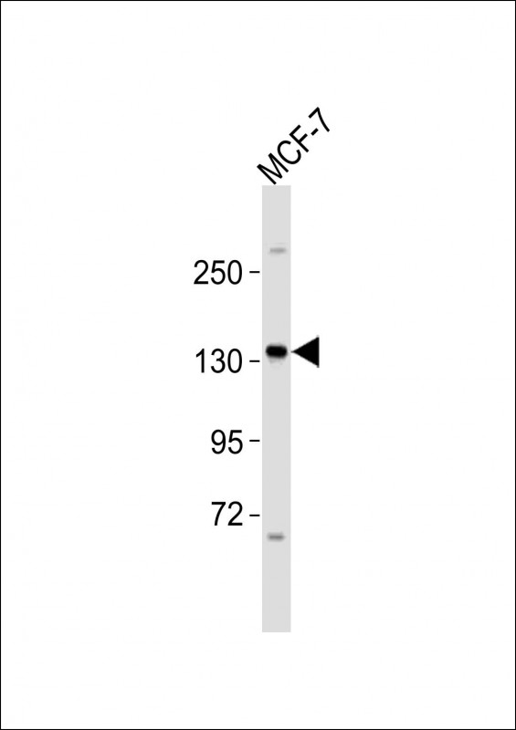 Anti-HER4 Antibody (pY1162)at 1:2000 dilution + MCF-7 whole cell lysates Lysates/proteins at 20 μg per lane. Secondary Goat Anti-Rabbit IgG, (H+L), Peroxidase conjugated at 1/10000 dilution Predicted band size : 147 kDa Blocking/Dilution buffer: 5% NFDM/TBST.