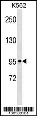 KIT Antibody (C-term S959)(Cat. APR04350G) western blot analysis in K562 cell line lysates (35ug/lane).This demonstrates the KIT antibody detected the KIT protein (arrow). |