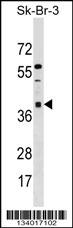 ARMC10 Antibody (N-term)(Cat. APR04354G) western blot analysis in SK-BR-3 cell line lysates (35ug/lane).This demonstrates the ARMC10 antibody detected the ARMC10 protein (arrow). |