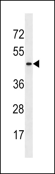 ARMCX4 Antibody (Center)(Cat. APR04359G) western blot analysis in HL-60 cell line lysates (35ug/lane).This demonstrates the ARMCX4 antibody detected the ARMCX4 protein (arrow). |