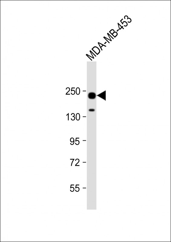 Anti-ERBB2 Antibody (S1054) at 1:8000 dilution + MDA-MB-453 whole cell lysate Lysates/proteins at 20 μg per lane. Secondary Goat Anti-Rabbit IgG, (H+L), Peroxidase conjugated at 1/10000 dilution. Predicted band size : 138 kDa Blocking/Dilution buffer: 5% NFDM/TBST. |