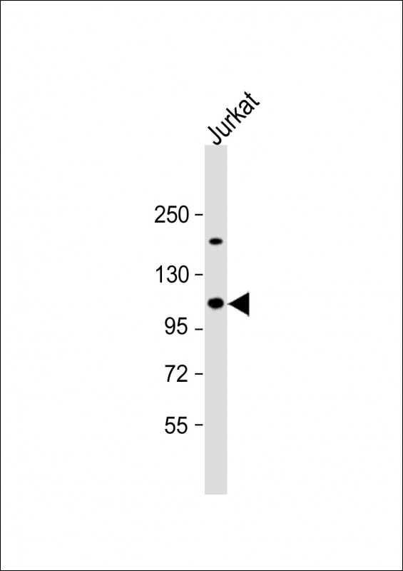 Anti-UBAP2L Antibody (Center) at 1:1000 dilution + Jurkat whole cell lysate Lysates/proteins at 20 μg per lane. Secondary Goat Anti-Rabbit IgG, (H+L), Peroxidase conjugated at 1/10000 dilution. Predicted band size : 115 kDa Blocking/Dilution buffer: 5% NFDM/TBST.