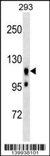 UBAP2L Antibody (Center) (Cat. APR04393G) western blot analysis in 293 cell line lysates (35ug/lane).This demonstrates the UBAP2L antibody detected the UBAP2L protein (arrow). |