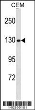 NCAPG Antibody (N-term) (Cat. APR04397G) western blot analysis in CEM cell line lysates (35ug/lane).This demonstrates the NCAPG antibody detected the NCAPG protein (arrow). |