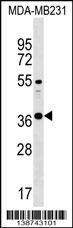 CTRB1 Antibody (Center) (Cat. APR04399G) western blot analysis in MDA-MB231 cell line lysates (35ug/lane).This demonstrates the CTRB1 antibody detected the CTRB1 protein (arrow). |