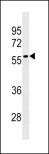 LRRC69 Antibody (Center) (Cat. APR04400G) western blot analysis in HepG2 cell line lysates (35ug/lane).This demonstrates the LRRC69 antibody detected the LRRC69 protein (arrow). |