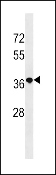 RN3L1 Antibody (C-term) (Cat. APR04402G) western blot analysis in WiDr cell line lysates (35ug/lane).This demonstrates the RN3L1 antibody detected the RN3L1 protein (arrow). |
