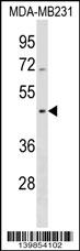 SEPT12 Antibody (Center)(Cat. APR04417G) western blot analysis in MDA-MB231 cell line lysates (35ug/lane).This demonstrates the SEPT12 antibody detected the SEPT12 protein (arrow). |