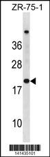 CDKN2A Antibody (N-term S8) (Cat. APR04435G) western blot analysis in ZR-75-1 cell line lysates (35ug/lane).This demonstrates the CDKN2A antibody detected the CDKN2A protein (arrow). |