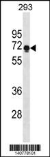 PRR14 Antibody (C-term) (Cat. APR04438G) western blot analysis in 293 cell line lysates (35ug/lane).This demonstrates the PRR14 antibody detected the PRR14 protein (arrow). |