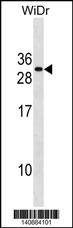 FADD Antibody (Center) (Cat. APR04445G) western blot analysis in WiDr cell line lysates (35ug/lane).This demonstrates the FADD antibody detected the FADD protein (arrow). |