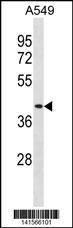 DPEP1 Antibody (N-term) (Cat. APR04454G) western blot analysis in A549 cell line lysates (35ug/lane).This demonstrates the DPEP1 antibody detected the DPEP1 protein (arrow). |