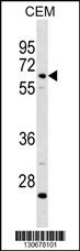 C8B Antibody (C-term) (Cat. APR04468G) western blot analysis in CEM cell line lysates (35ug/lane).This demonstrates the C8B antibody detected the C8B protein (arrow). |