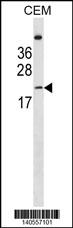 LIN7B Antibody (N-term) (Cat. APR04471G) western blot analysis in CEM cell line lysates (35ug/lane).This demonstrates the LIN7B antibody detected the LIN7B protein (arrow).