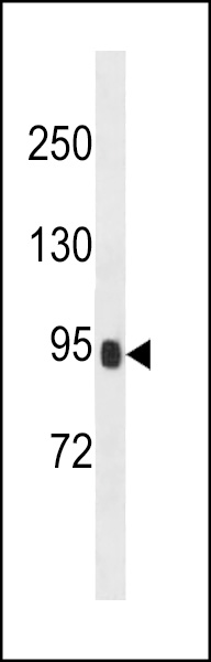 PRSS36 Antibody (Center) (Cat. APR04475G) western blot analysis in NCI-H292 cell line lysates (35ug/lane).This demonstrates the PRSS36 antibody detected the PRSS36 protein (arrow). |