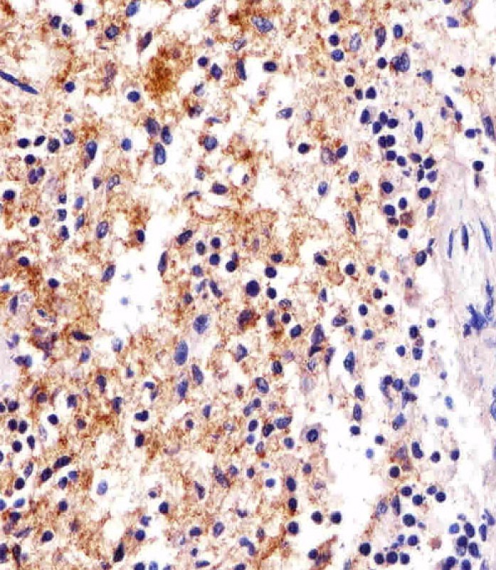 Immunohistochemical analysis of paraffin-embedded H. spleen section using FCER1G Antibody (C-term)( APR04490G). APR04490G was diluted at 1:25 dilution. A undiluted biotinylated goat polyvalent antibody was used as the secondary, followed by DAB staining.