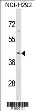 SERPINB9 Antibody (Center) (Cat. APR04495G) western blot analysis in NCI-H292 cell line lysates (35ug/lane).This demonstrates the SERPINB9 antibody detected the SERPINB9 protein (arrow). |