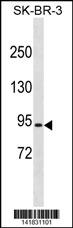 RFWD2 Antibody (C-term) (Cat. APR04496G) western blot analysis in SK-BR-3 cell line lysates (35ug/lane).This demonstrates the RFWD2 antibody detected the RFWD2 protein (arrow). |