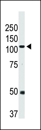 Anti-BMPR2 Antibody (D43) at 1:1000 dilution + human heart lysate Lysates/proteins at 20 μg per lane. Secondary Goat Anti-Rabbit IgG, (H+L), Peroxidase conjugated at 1/10000 dilution. Predicted band size : 115 kDa Blocking/Dilution buffer: 5% NFDM/TBST.