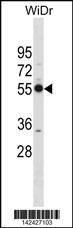 PSMD12 Antibody (Center) (Cat. APR04513G) western blot analysis in WiDr cell line lysates (35ug/lane).This demonstrates the PSMD12 antibody detected the PSMD12 protein (arrow). |