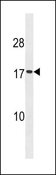 SEC11A Antibody (Center) (Cat. APR04514G) western blot analysis in HepG2 cell line lysates (35ug/lane).This demonstrates the SC11A antibody detected the SEC11A protein (arrow). |