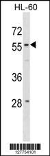 WDR21A Antibody (N-term) (Cat. APR04516G) western blot analysis in HL-60 cell line lysates (35ug/lane).This demonstrates the WDR21A antibody detected the WDR21A protein (arrow). |