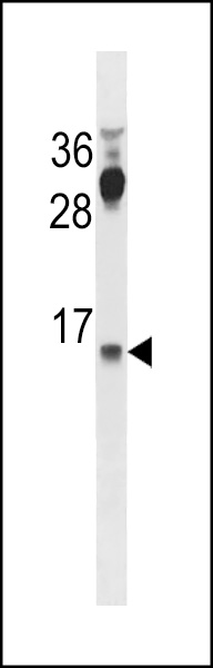 CYYR1 Antibody (C-term) (Cat. APR04517G) western blot analysis in HepG2 cell line lysates (35ug/lane).This demonstrates the CYYR1 antibody detected the CYYR1 protein (arrow). |