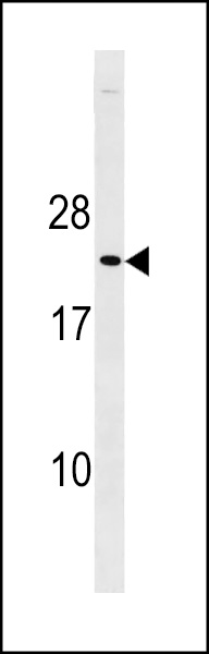 Mouse p27Kip1 Antibody (C-term T197) (Cat. APR04544G) western blot analysis in mouse heart tissue lysates (35ug/lane).This demonstrates the (mouse) p27Kip1 antibody detected the (mouse) p27Kip1 protein (arrow). |