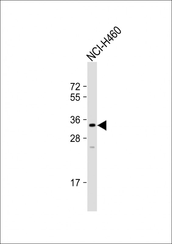 Anti-FAM26F Antibody (C-term) at 1:1000 dilution + NCI-H460 whole cell lysate Lysates/proteins at 20 μg per lane. Secondary Goat Anti-Rabbit IgG, (H+L), Peroxidase conjugated at 1/10000 dilution. Predicted band size : 34 kDa Blocking/Dilution buffer: 5% NFDM/TBST.