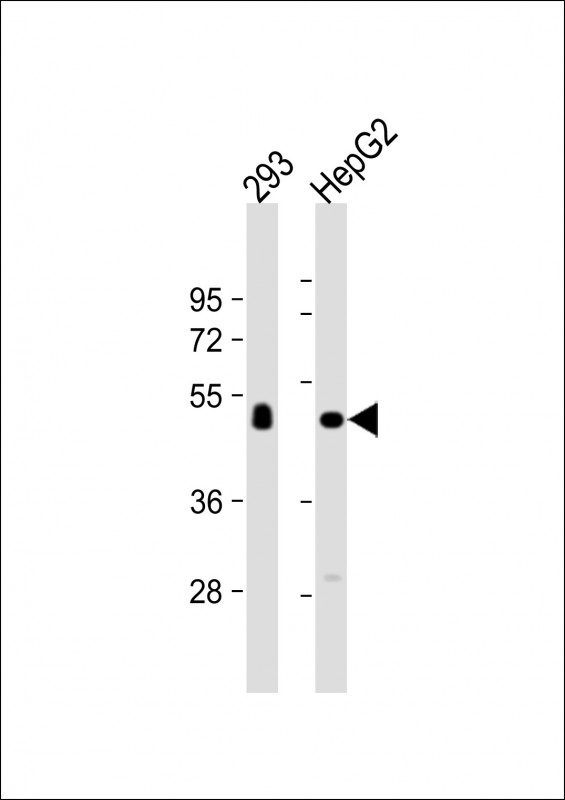 All lanes : Anti-CPVL Antibody (C-term) at 1:1000 dilution Lane 1: 293 whole cell lysate Lane 2: HepG2 whole cell lysate Lysates/proteins at 20 μg per lane. Secondary Goat Anti-Rabbit IgG, (H+L), Peroxidase conjugated at 1/10000 dilution. Predicted band size : 54 kDa Blocking/Dilution buffer: 5% NFDM/TBST. |